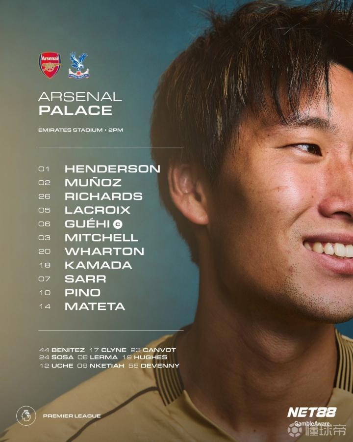 水晶宫队的首发阵容为:1号迪恩-亨德森、2号穆尼奥斯、26号克里斯-理查兹、5号拉克鲁瓦、6号格伊、3号米切尔、20号亚当-沃顿、18号镰田大地、7号伊斯梅拉-萨尔、10号耶雷米-皮诺、14号马特塔