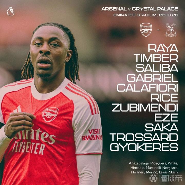 北京时间10月26日22点整,英超联赛第9轮将上演一场备受瞩目的伦敦德比,阿森纳队将在主场迎战水晶宫队,赛前双方已经陆续公布了各自的首发阵容名单: